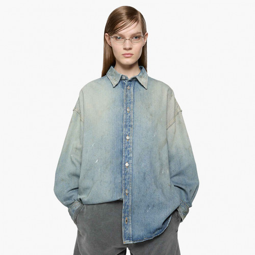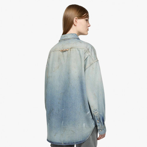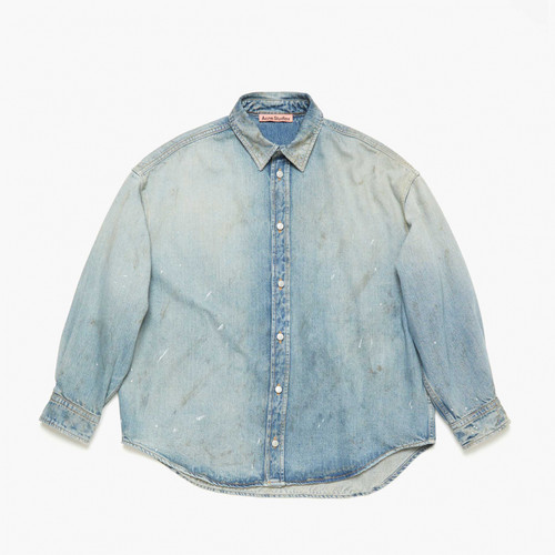 Dieses Button-up-Hemd von Acne Studios ist aus einem Twill-Baumwollmisch-Denim in einem hellblauen Waschton gefertigt und mit getönten sowie bemalten Details versehen. Es ist in einer entspannten Unisex-Passform und hüftbedeckender Länge geschnitten.