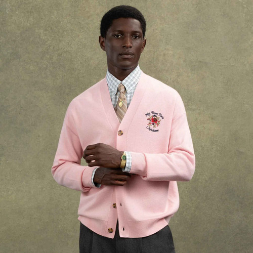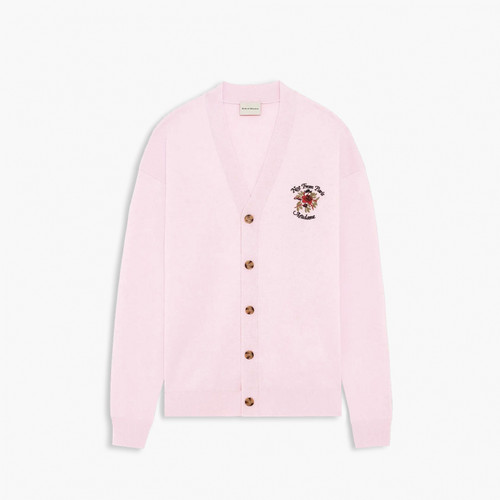 This light pink long-sleeved cardigan is made from 100% merino wool. With a classic fit, it features a V-neck, low armholes, a Rose Slogan embroidery, ribbed trims, and five buttons at the front.