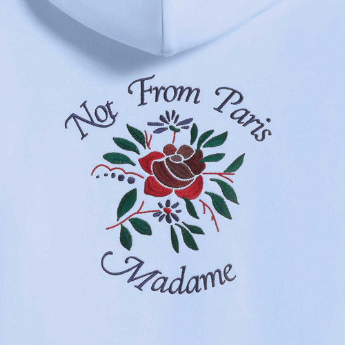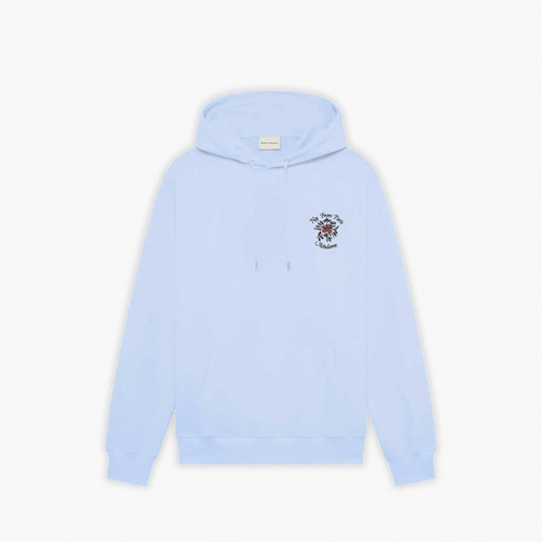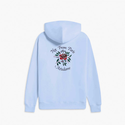 This light blue 100% cotton French terry hoodie features the Slogan Rose embroidery on the front and back. It has a drawstring hood with waxed tips, a kangaroo pocket and ribbed hem and cuffs.