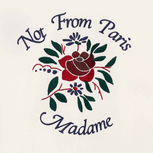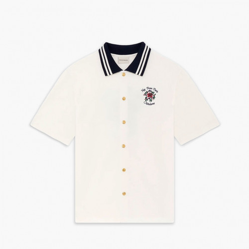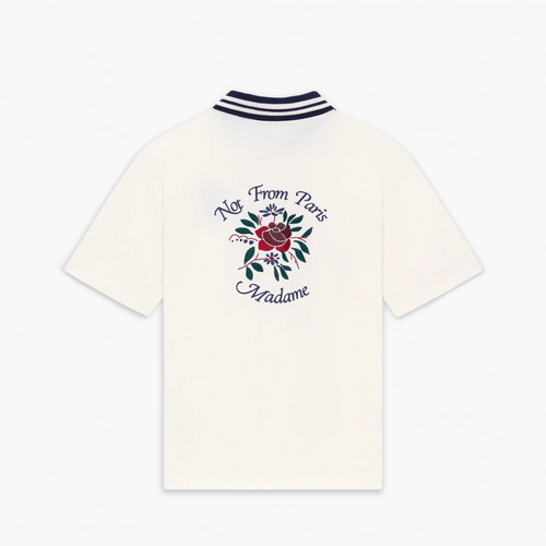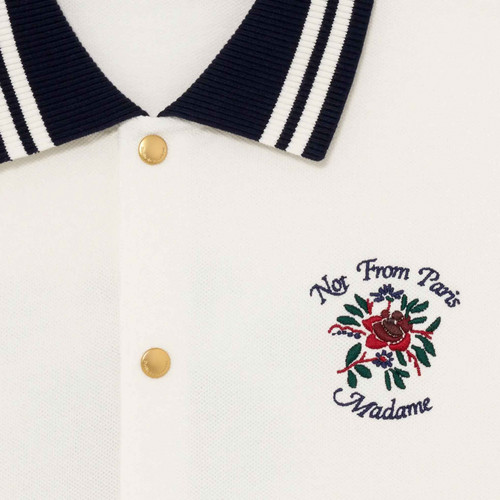 This off white short-sleeved shirt, made from 100% piqué cotton, features a Slogan Rose embroidery on the front and back. It has a contrasting ribbed collar and a snap-button closure with engraved buttons.