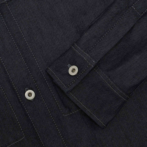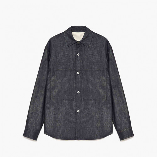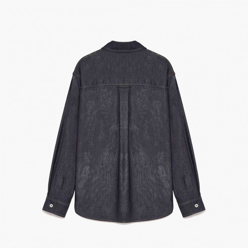 The Jil Sander Denim Shirt in Magnet blends minimalist design with premium denim craftsmanship. Made from lightweight raw denim, this long-sleeve shirt features a relaxed fit and subtle tonal stitching. Details include a front metal denim button closure, a large integrated chest pocket, and a small branded leather tab in the side seam, making it a versatile piece for modern casual or layered outfits.