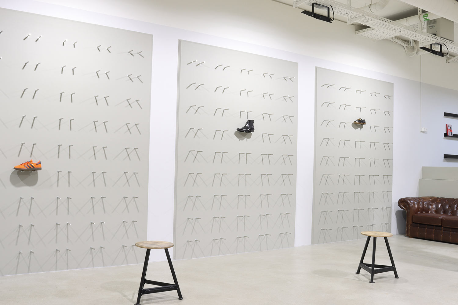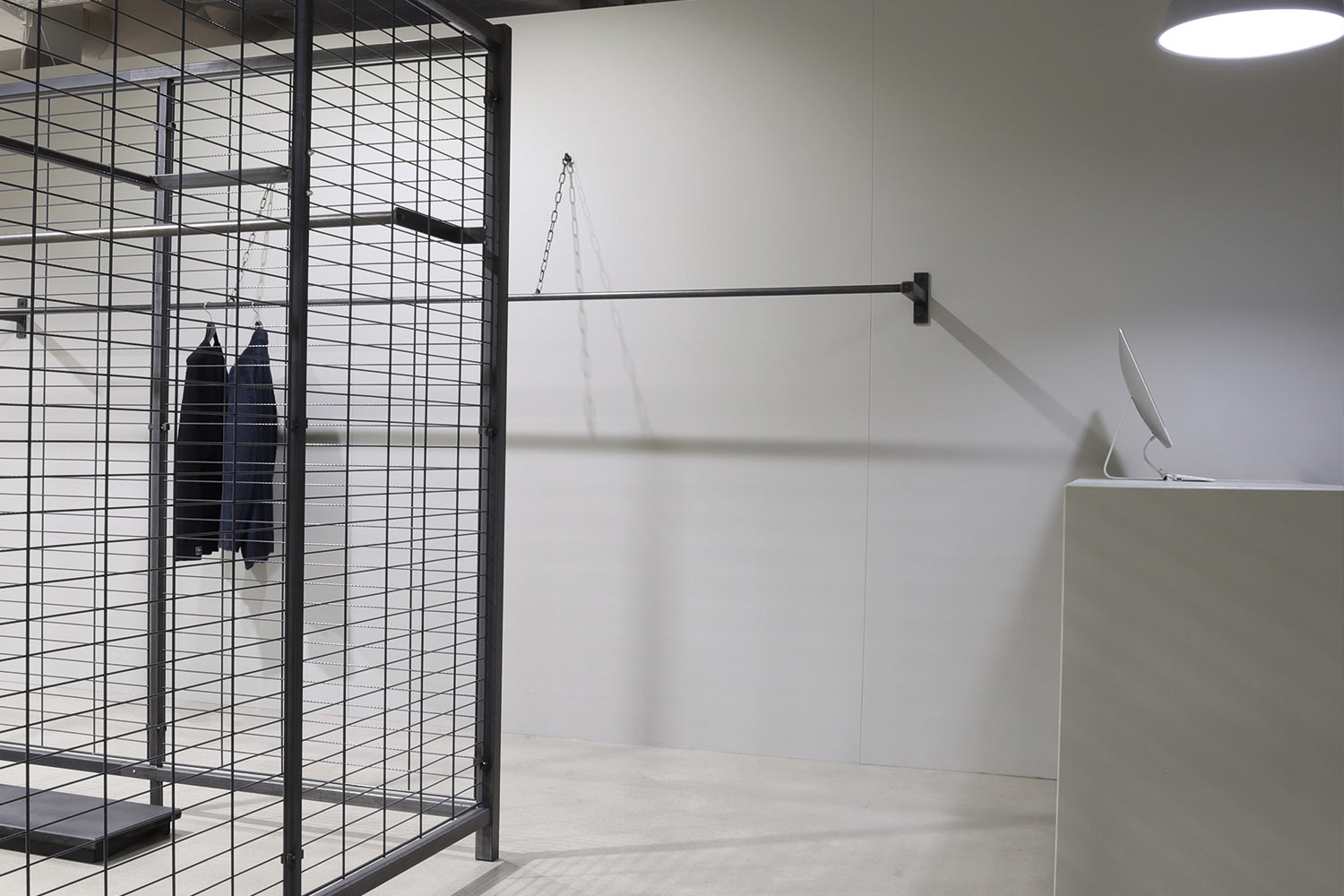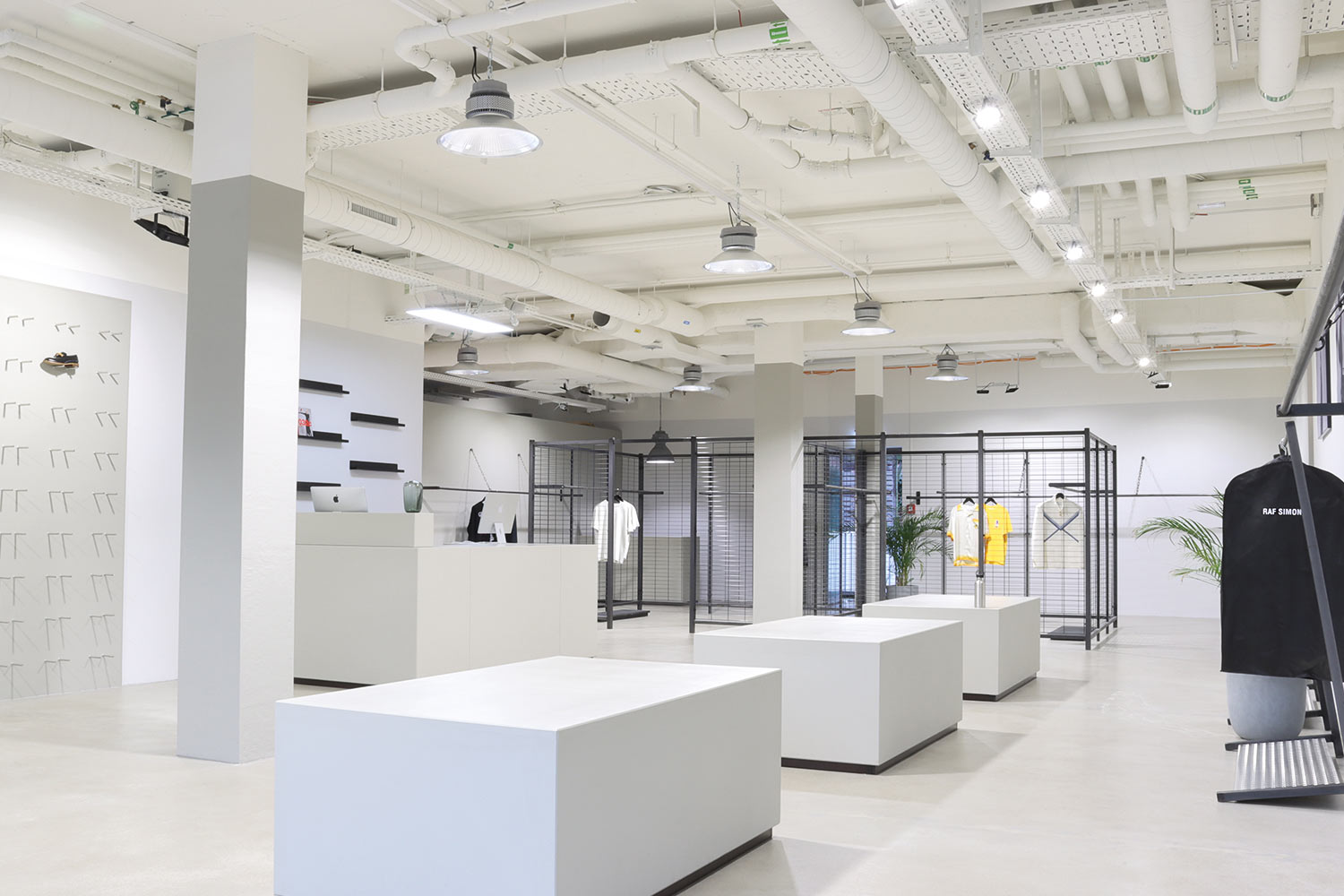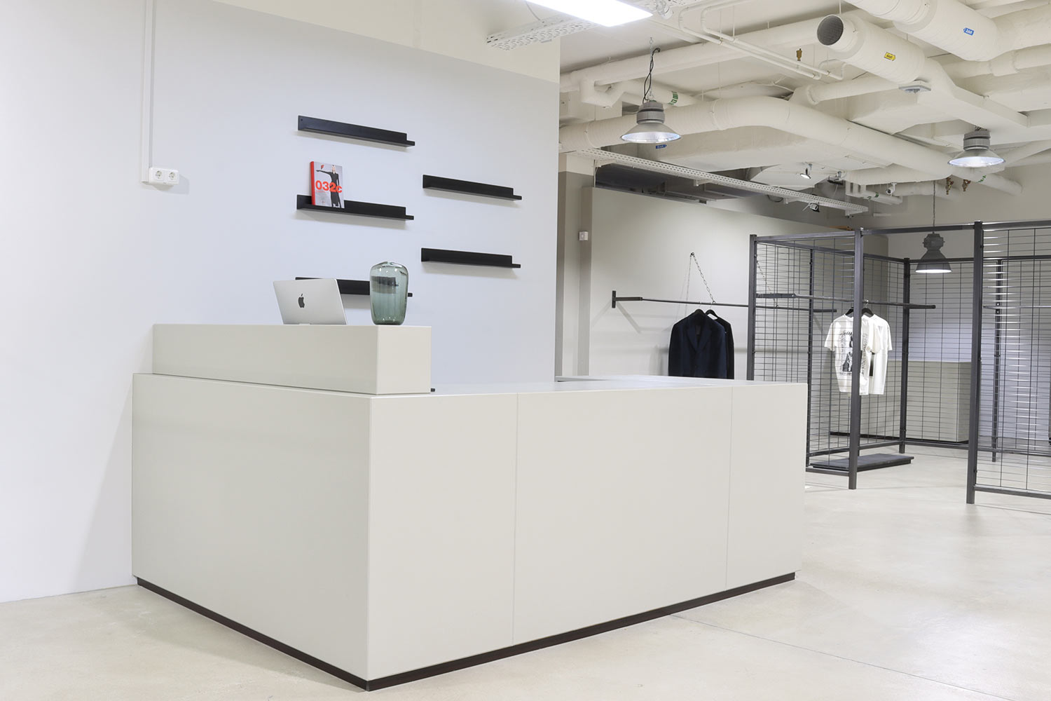 Der industrielle Hintergrund des ursprünglichen Standortes wurde kompromisslos in den Ladenbau integriert. Für ein modernes und minimalistisches Interieur wurden überwiegend Beton und Stahl verwendet.