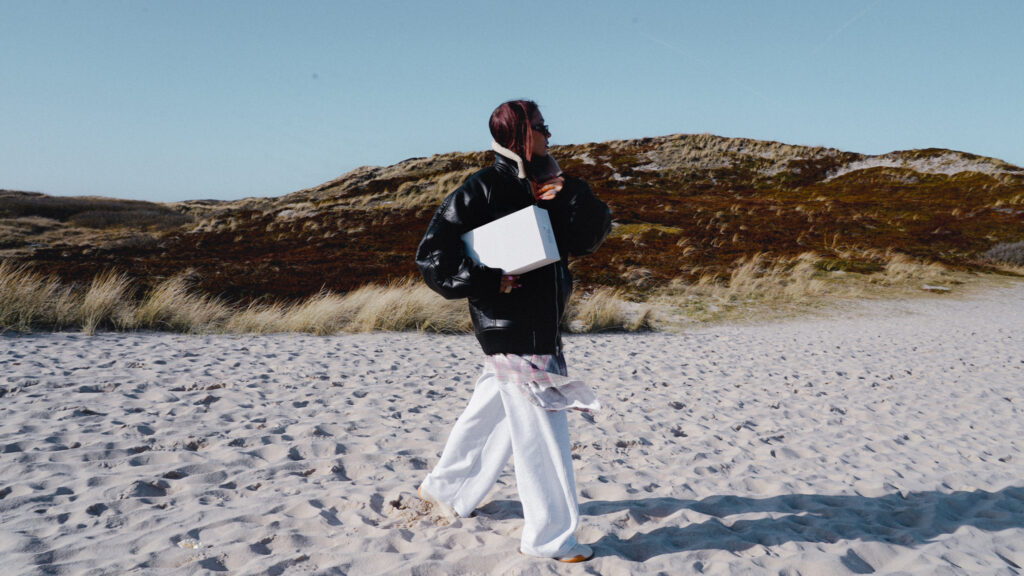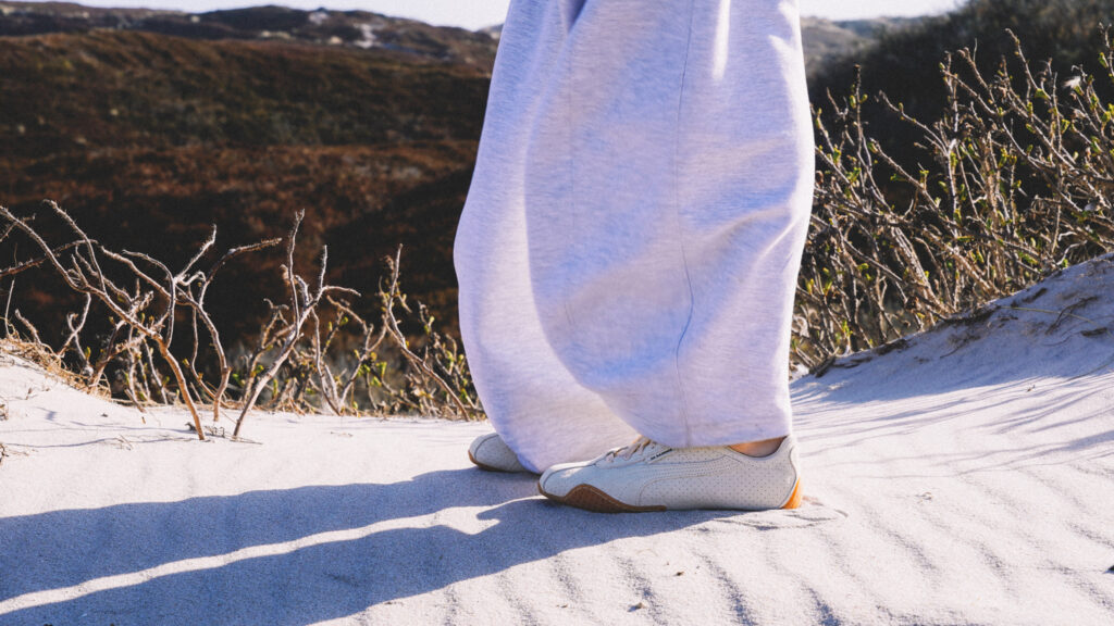 Captured by Leipzig-based creative director and photographer Jupp Simon, the series places the shoe within a natural setting that enhances its understated presence. The soft tones of sand and sky echo the palette of the product, while the rawness of the environment contrasts its refined construction. Together, they create a visual tension that feels both grounded and elevated.